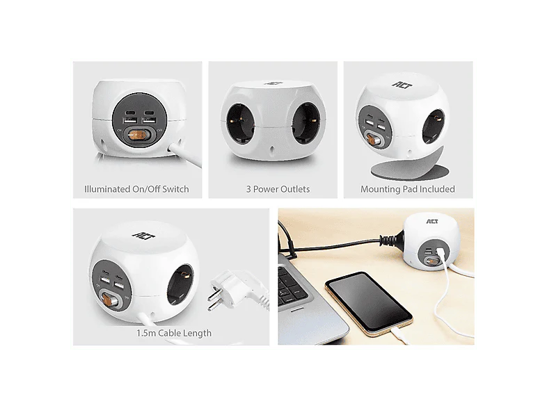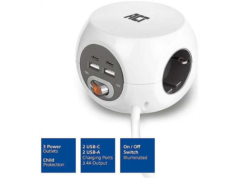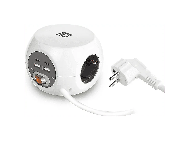 La multiprise USB-C/USB-A/AC (AC2415) d’ACT en blanc est un bloc d’alimentation pratique et polyvalent pour la maison ou le bureau. Compacte et facile à installer, elle offre 3 prises secteur, 2 ports USB-C et 2 ports USB-A pour brancher et recharger plusieurs appareils simultanément. Elle dispose d’un câble de 1,5 m, un interrupteur marche/arrêt et une protection contre surtension et courts-circuits, pour plus de sécurité.