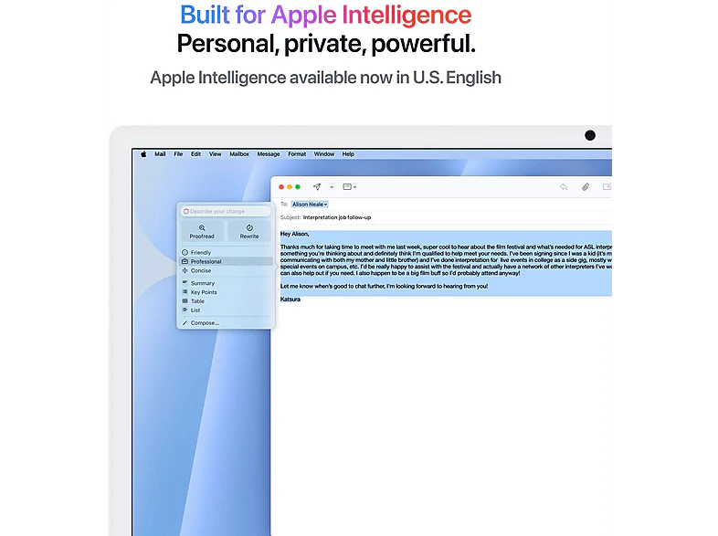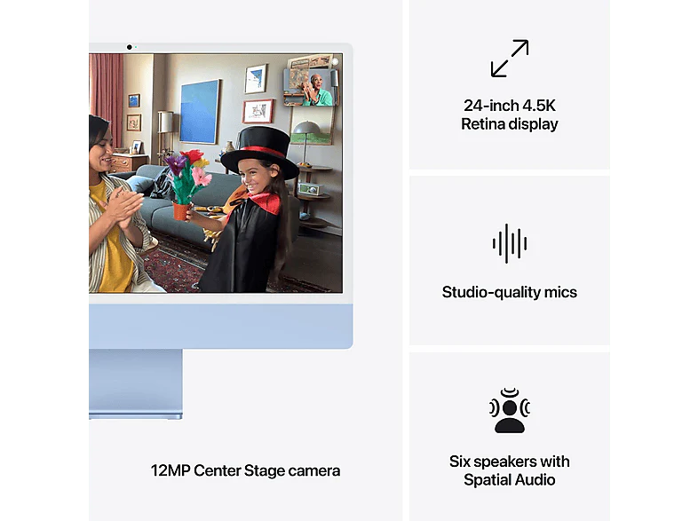 Disponible en sept couleurs éclatantes, cet ordinateur de bureau tout en un affiche un design extra-fin, rehaussant le style de n’importe quelle pièce. L’écran Retina 4,5K de 24 pouces offre 500 nits de luminosité et prend en charge un milliard de couleurs. Redoublez d’efficacité grâce à la puce Apple M4. De la retouche photo à la création de présentations en passant par le gaming, elle vous évite tous les obstacles. Une caméra 12MP Center Stage, trois micros de qualité studio et six haut-parleurs avec Audio spatial vous permettent de rester dans le cadre et de vous faire parfaitement entendre.