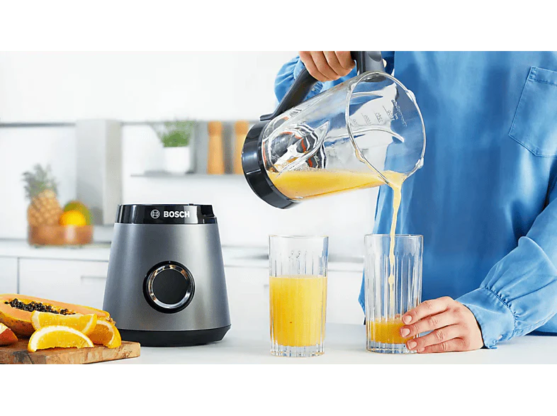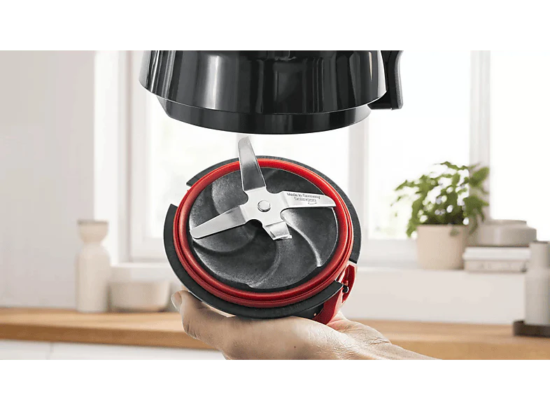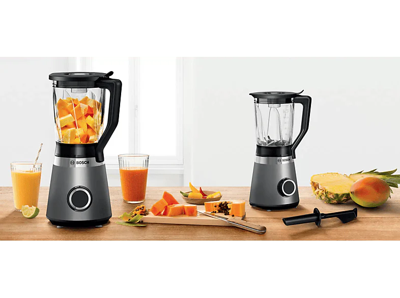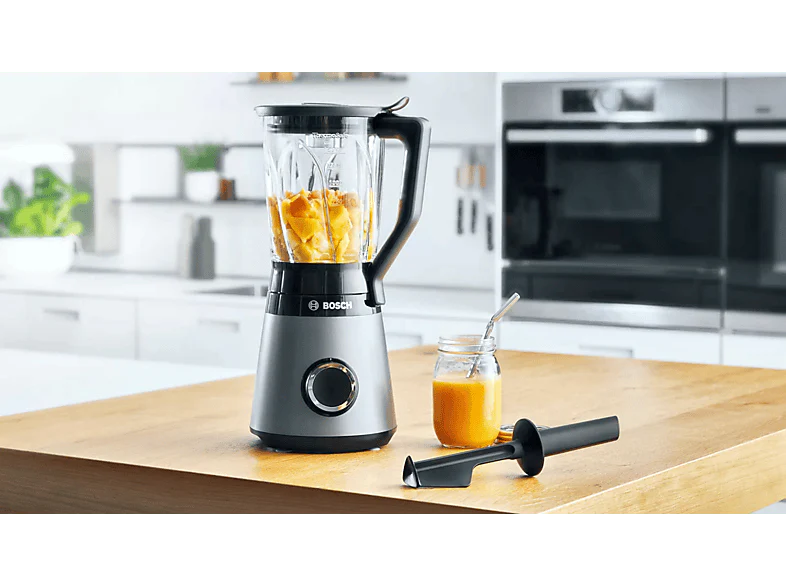 Ce blender est équipé d’un moteur Bosch puissant de 1200 watts qui tourne jusqu’à 30 000 t/m et te permet d’écraser aisément toutes sortes d’ingrédients. Ainsi, tu prépares aussi bien des soupes onctueuses que des tapenades sans oublier les smoothies et la glace pillée pour tes cocktails. Ce blender polyvalent s’avèrera vite être un assistant de cuisine indispensable. Il est non seulement puissant mais aussi très facile à utiliser : il suffit d’appuyer sur le bouton rond plus ou moins en longtemps en fonction de la texture que tu souhaites obtenir. De plus, le couvercle hermétique du pichet dispose d’une ouverture pour ajouter des ingrédients en cours de mélange. Super pratique non ?