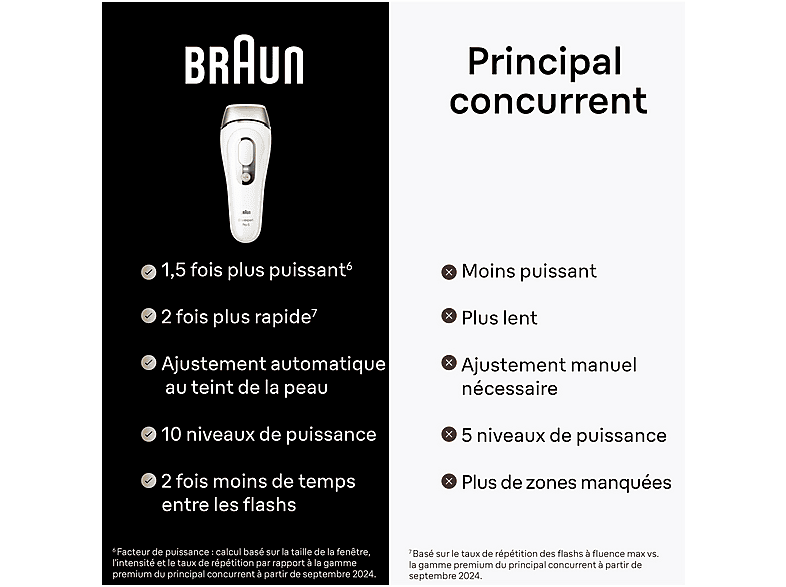 Le Silk-expert Pro 5 de Braun offre une alternative douce à l’épilation au laser, grâce à son système d’épilation à lumière pulsée avancé. Adapté à une épilation pour les aisselles, jambes, torse, visage et maillot, il offre une réduction visible des poils en seulement 2 séances. Son utilisation est simple et confortable, grâce à son design ergonomique. Avec son capteur SkinProtect testé dermatologiquement qui analyse les variations de ton teint de peau pour adapter ses flashs de lumière et ses 3 modes d’intensités, tu obtiens des résultats qui dureront jusqu’à 2 ans. Le Pro 5 produit jusqu’à 125 flashs par minute pour te garantir une épilation uniforme de ta peau, même dans les zones les plus sensibles. Rapide et efficace, il te permet d’effectuer une séance d’épilation depuis chez toi, en seulement 10 minutes.