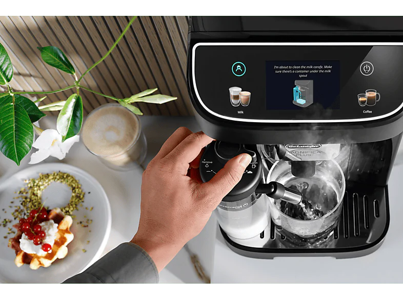 De’Longhi a équipé cette machine à expresso d’un écran tactile 3,5 pouces (8,89 cm) avec icônes explicites, simplifiant ton utilisation. Pour tes boissons lactées, la technologie LatteCrema Hot crée une mousse onctueuse en 3 textures : compacte, crémeuse ou légère. Pour plus de commodité, le système se nettoie automatiquement après chaque usage d’une simple pression. L’entretien demeure facile : les composants amovibles passent au lave-vaisselle et sont rapidement prêts à l’emploi.