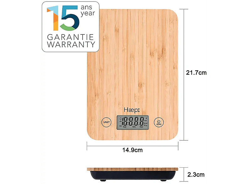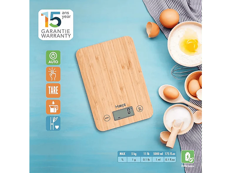 Cette balance de cuisine en bambou de la marque Haepi offre élégance, durabilité et, surtout, une précision inégalée. Elle peut peser jusqu’à 5 kilos avec une précision de 1 gramme, de sorte que tu disposes toujours de la bonne quantité de chaque ingrédient lorsque tu cuisines. Cette balance de cuisine est pratique et multifonctionnelle, puisqu’elle permet de peser aussi bien de la farine et du sucre, que des liquides tels que du lait ou de l’eau. La fonction TARE permet de réinitialiser facilement le poids de départ pour reprendre la mesure à zéro, ce qui est utile lorsque tu dois peser et mélanger plusieurs ingrédients différents. Les piles avec lesquelles elle fonctionne sont incluses, afin que tu puisses commencer à utiliser la balance tout de suite. Enfin, Haepi offre une garantie de 15 ans sur l’appareil.