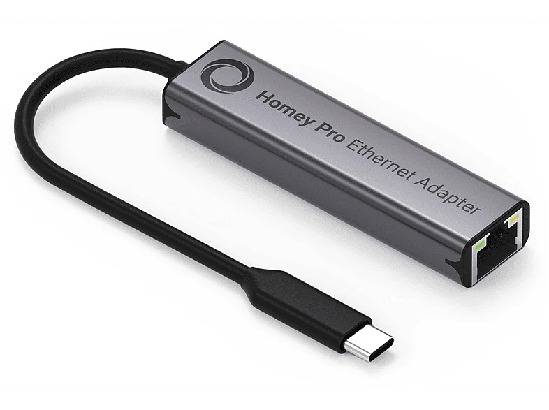 L’adaptateur Ethernet possède des dimensions modestes de 2,5 x 1,5 x 10 cm ainsi qu’un câble court de 20 cm. Fabriqué en plastique, il a été conçu pour se s’accorder visuellement avec le Homey Pro, en disparaissant de ton esprit. Avec sa finition lisse brillante en gris foncé, son câble mat et ses angles arrondis il s’accorde avec aise avec la station domotique Homey Pro. En fin de compte, l’adaptateur se fondra dans ton intérieur.