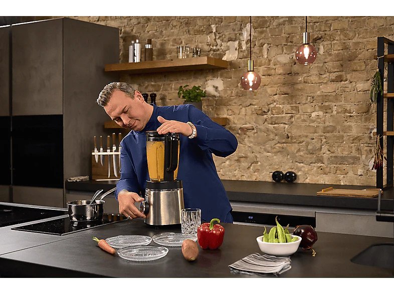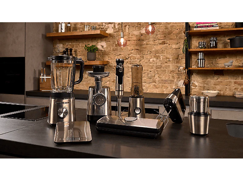 La lame à six ailettes avec revêtement en titane réduit sans effort les ingrédients en une texture fine et lisse, garantissant ainsi des résultats de mixage parfaits. Le blender sur socle séduit non seulement par ses performances, mais aussi par son boîtier en acier inoxydable, robuste et durable. Il s’intègre élégamment dans n’importe quelle cuisine.