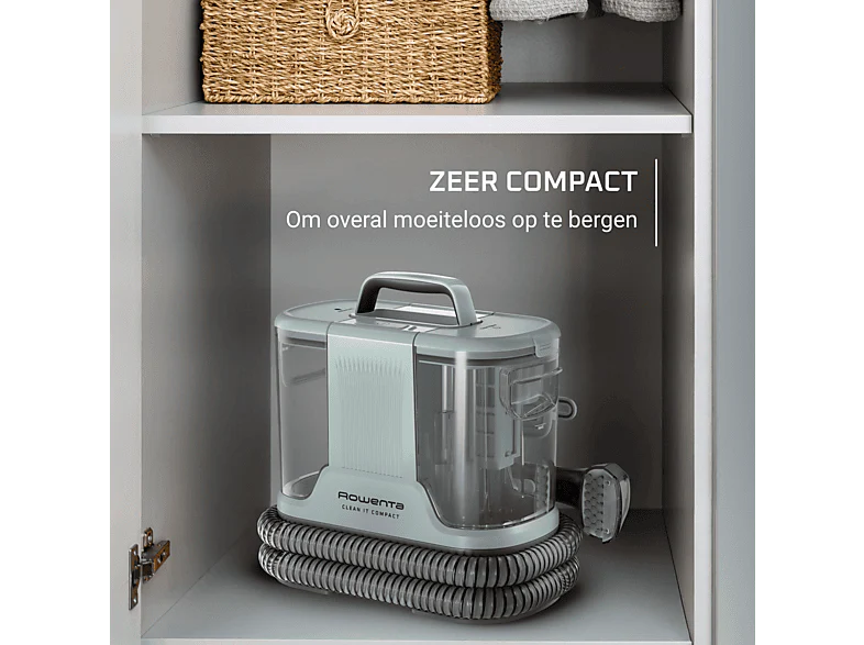 Avec cette shampouineuse Clean It Compact IN3020F0 de Rowenta en vert eucalyptus, tes tapis et tissus d’ameublement restent propre en permanence. Ce modèle compact et portatif avec ses dimensions de 32,9 x 25 x 38 cm est simple à utiliser. Il élimine en un tour de main les taches des tapis, moquettes, canapés, fauteuils, chaises en et les sièges de voiture grâce aux différents embouts inclus. Le tuyau de 1,65 m et son cordon électrique de 4 m s’enroulent facilement autour de l’appareil pour un rangement efficace dans le placard. Enfin, la poignée pliable sur le dessus est pratique pour le déplacer.