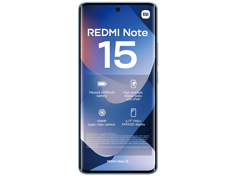 Le Redmi Note 15 de Xiaomi en coloris bleu est un smartphone conçu pour t’accompagner au quotidien. Il est doté d’un grand écran lumineux FHD+ AMOLED de 6.77 pouces (17.18 cm) d’une résolution de 2392 x 1080 pixels. Il possède une batterie de 6000 mAh qui te garantit jusqu’à 2 jours d’utilisation, et plus de 24h de visionnage vidéo. Certifié IP64, il est fabriqué avec des matériaux robustes pour sa coque et l’écran qui lui confèrent une résistance accrue face aux chutes accidentelles du quotidien. Il est doté d’un appareil photo arrière de 108 MP, offrant un mode de capture Ultra HD, pour des photos ultra nettes. Avec 6 Go de RAM et le processeur MediaTek Helio G100 Ultra, tes applications se lancent rapidement et fonctionnent sans accroc. De plus, avec 128 Go d’espace de stockage, extensible jusqu’à 2 To avec une carte microSD non incluse, tu pourras facilement stocker toutes tes photos, vidéos et applications lourdes.