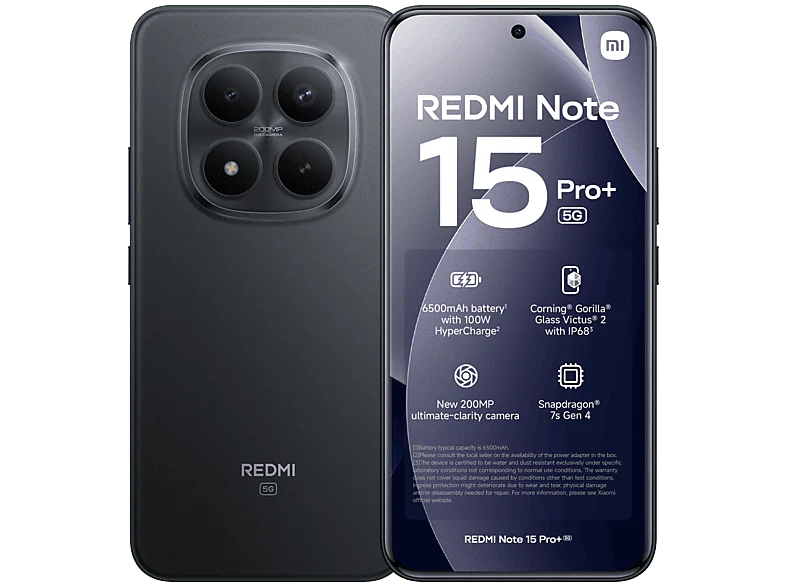 Le Redmi Note 15 Pro+ 5G de Xiaomi en coloris noir est un smartphone robuste conçu pour t’accompagner au quotidien. Il est doté d’un grand écran lumineux CrystalRes AMOLED de 6.83 pouces (17.34 cm) d’une résolution de 2392 x 1080 pixels. Résistant à la poussière et à l’eau grâce à ses certifications IP66/IP68/IP69/IP69K, il est fabriqués avec des matériaux robustes pour sa coque et l’écran qui lui confèrent une résistance accrue face aux chutes accidentelles. Il est équipé d’un appareil photo arrière de 200 MP, offrant un mode de capture Ultra HD, pour des photos ultra nettes. Avec 8 Go de RAM et le processeur SnapDragon 7s Gen 4, tes applications se lancent rapidement et fonctionnent sans accroc. De plus, avec 256 Go d’espace de stockage, tu pourras facilement stocker toutes tes photos, vidéos et applications lourdes. Enfin, il possède une batterie impressionnante de 6500 mAh qui te garantit jusqu’à 2 jours d’utilisation, et de 25 h de visionnage vidéo,